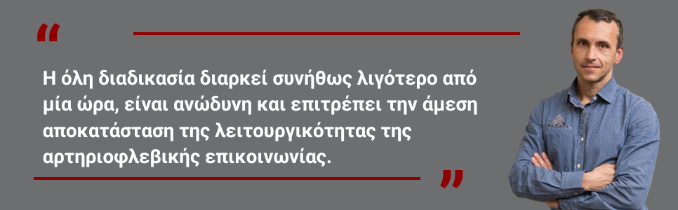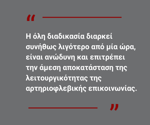 Η όλη διαδικασία διαρκεί συνήθως λιγότερο από μία ώρα, είναι ανώδυνη και επιτρέπει την άμεση αποκατάσταση της λειτουργικότητας της αρτηριοφλεβικής επικοινωνίας.
