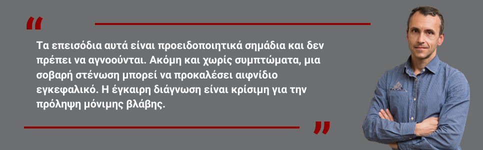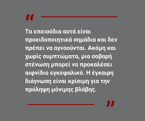 Τα επεισόδια αυτά είναι προειδοποιητικά σημάδια και δεν πρέπει να αγνοούνται. Ακόμη και χωρίς συμπτώματα, μια σοβαρή στένωση μπορεί να προκαλέσει αιφνίδιο εγκεφαλικό. Η έγκαιρη διάγνωση είναι κρίσιμη για την πρόληψη μόνιμης βλάβης.